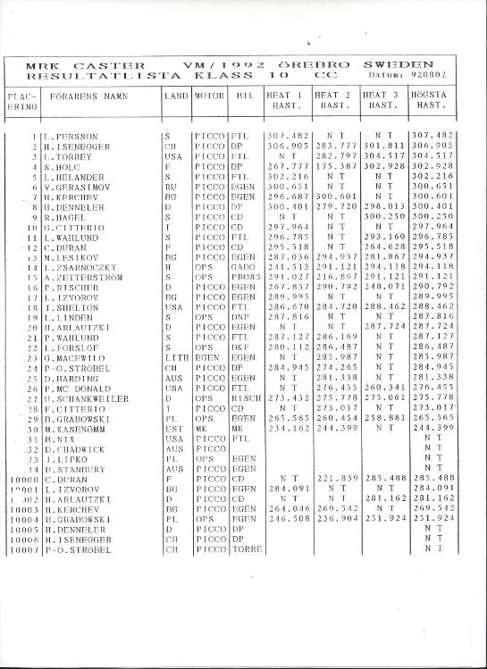 5 cc, T Sepp (EST) 297 km/t och Kiechl (CH) 295 km/t, han körde den nya Ströbel/Profi 5an. Den är nu klar och kan köpas av Ströbel en mycket välgjord motor med stålfront. Falks framvagn rasade (det är banans fel, så det så.) men 298 km/h. Kom på andra plats ändå. Italienare Adreani slog till med 301km/t och vann. Björks 5a hade höjd komp (dumt) och kolven slog i toppen (såg inte det i den mörka depån), resultat 287Km/h och 9a.